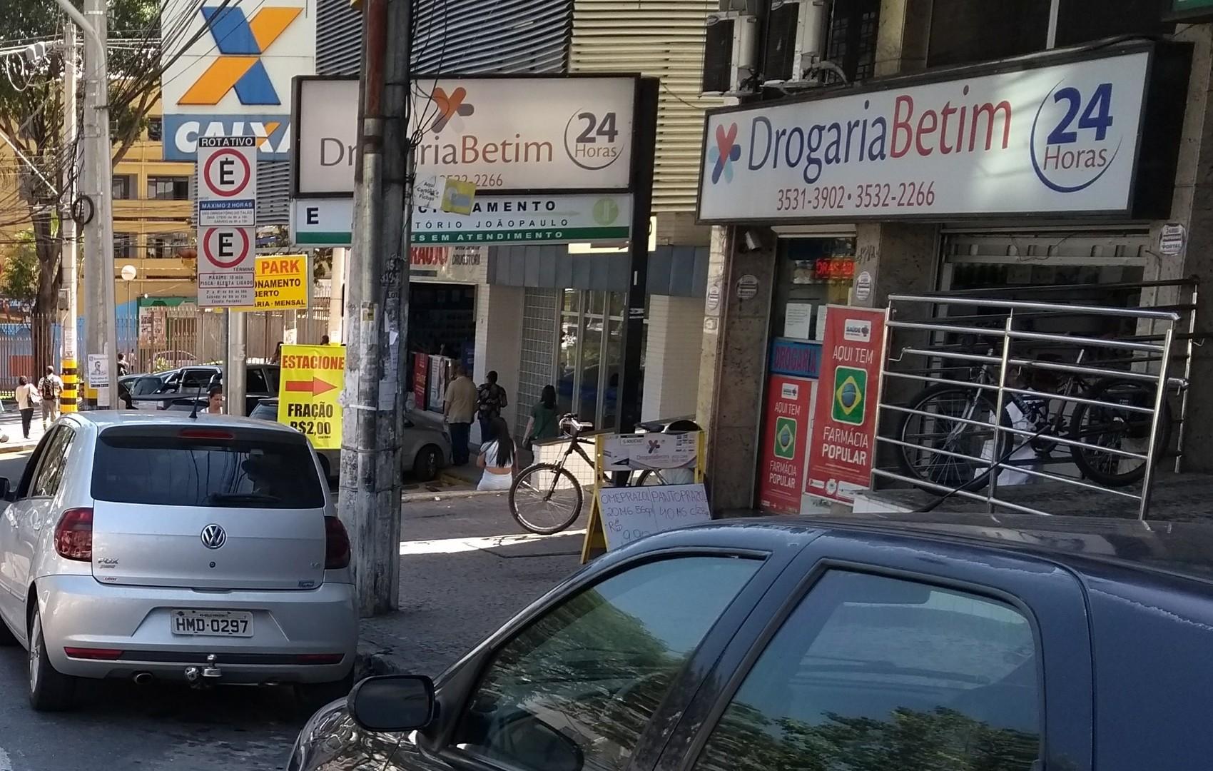 Parado enfrente à uma farmácia e usando a rede de banco caixa econômica